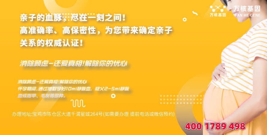 此外还有宝鸡陈仓个人亲子鉴定,如:怀疑孩子非亲生,又不想其他人知道的。当然,这只是其中的一些例子,更多鉴定问题在线咨询宝鸡陈仓亲子鉴定基因检测,办理地址:宝鸡市陈仓区大道千渭星城264号(如需要办理 提前电话或微信预约)-预约电话:4001789498。